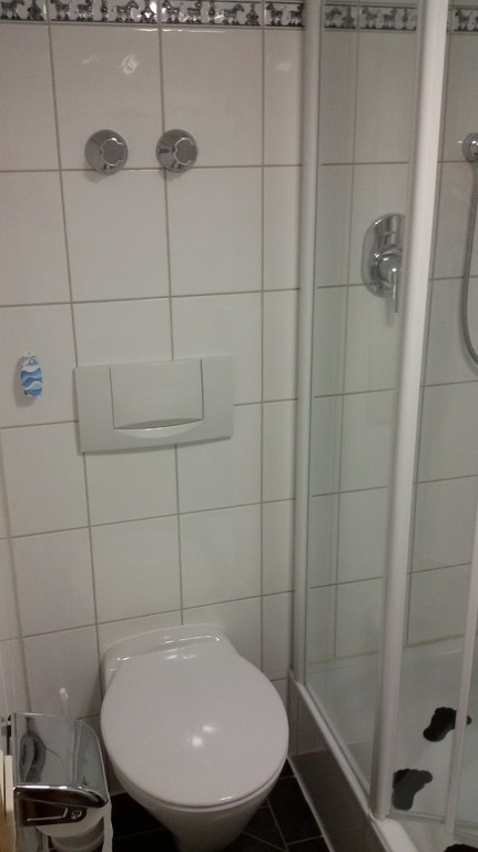 Badezimmer mit Dusche und Fön. Wohn-Essbereich gemütliche Couch mit Ausziehfunktion für 2 Personen, Flachbildfernseher mit integriertem Receiver, gemütliche Essecke.